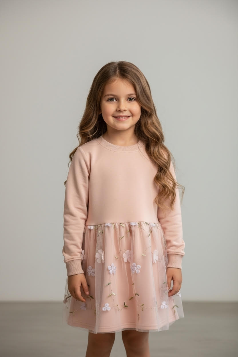 Sudėtis: kilpinis trikotažas (95proc. medvilnė, 5proc. elastanas). Be pūkelio. Suknelė puošta tiuliu.